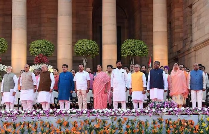 રાષ્ટ્રપતિ ભવનમાં રવિવારે સાંજે નરેન્દ્ર મોદીએ સતત ત્રીજી વખત વડાપ્રધાન પદના શપથ ગ્રહણ કર્યા હતા. શપથ ગ્રહણ કરતાની સાથે જ તેમણે દેશના પ્રથમ વડાપ્રધાન જવાહરલાલ નેહરુના વિક્રમની બરાબરી કરી છે. પીએમ નરેન્દ્ર મોદીની સાથે 72 મંત્રીઓએ પણ શપથ ગ્રહણ કર્યા હતા. જેમાં 31 કેબિનેટ મંત્રીઓ, 5 સ્વતંત્ર પ્રભાર સાથેના રાજ્યમંત્રી અને 36 રાજ્ય મંત્રી સામેલ છે.