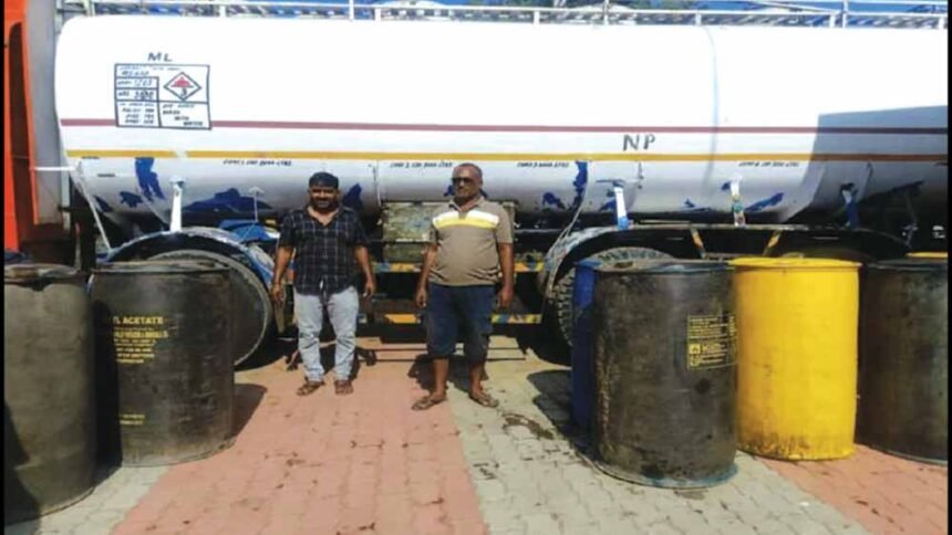 માળીયા (મી) તાલુકા પોલીસે સોનગઢ ગામે મોટી કાર્યવાહી કરતા ડીઝલ ચોરીનો પર્દાફાશ કર્યો છે. પોલીસને મળેલ બાતમીના આધારે સોનગઢ ગામમાં રામજી મંદિર પાછળ રેઇડ કરતા ટેન્કરમાથી ડીઝલ ચોરી કરતા બે ઈસમોને કુલ કિંમત રૂ. 47,14,800 નાં મુદામાલ સાથે માળીયા પોલીસે ઝડપી પાડયા હતા. માળીયા મીયાણા તાલુકા પોલીસ સ્ટેશના સર્વેલન્સ સ્ટાફને બાતમી મળેલ કે, સોનગઢ ગામના રામજી મંદિર પાછળ અમુક ઇસમો ટેન્કરમાંથી ડિઝલ ચોરી કરતા હોવાની બાતમીના આધારે બાતમીવાળી જગ્યાએ સફળ રેઇડ કરી 200 લીટરની ક્ષમતાવાળા બેરલ નંગ 09 મા રહેલ ડિઝલ લી 1800 કિ રૂ 1,44,000/- તથા એક ટેન્કર જેના રજી નં ૠઉં-19-ઢ-1551 જેની કિ રૂ 28,00,000/- તથા ટેન્કરમાં ભરેલ ડીઝલ આશરે 22000 લીટર જેની કિ રૂ. 17,60,000/- મળી કુલ મુદામાલ કિ.રૂ. 47,14,800/- સાથે બે ઇસમો શ્યામજીસિંધ કૈલાષસિંધ રાજપુત (ઉ.વ.53) રહે. હાલ અમદાવાદ, સહજાનંદ રેસીડન્સી દસક્રોઇ,બારેજા તા.જી.અમદાવાદ મુળ રહે. રયા તા.જી.ભદોઇ ભદોઇ (યુ.પી) તથા પરેશભાઇ ઉર્ફે લાલો ભુરાભાઇ વીરડા (ઉ.વ-41) રહે. સોનગઢ તા.માળીયા (મીં) વાળાને પકડી પાડી પુછપરછ કરતા અન્ય એક શખ્સ દશરથભાઈ જશાભાઇ હુંબલ રહે મોટી બરાર, તા.માળીયા મીયાણાવાળાનુ નામ ખુલતા કુલ ત્રણ ઇસમો વિરૂધ્ધ ગુન્હો દાખલ કરી આગળની કાર્યવાહી હાથ ધરેલ છે.