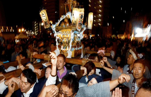 ટોક્યોની દક્ષિણે, જાપાનના યોકોસુકામાં નવા વર્ષની ઉજવણી માટે કાઉન્ટડાઉન ઇવેન્ટ દરમિયાન લોકો પ્રકાશિત ‘મિકોશી’ અથવા પોર્ટેબલ મંદિર લઈ જાય છે.