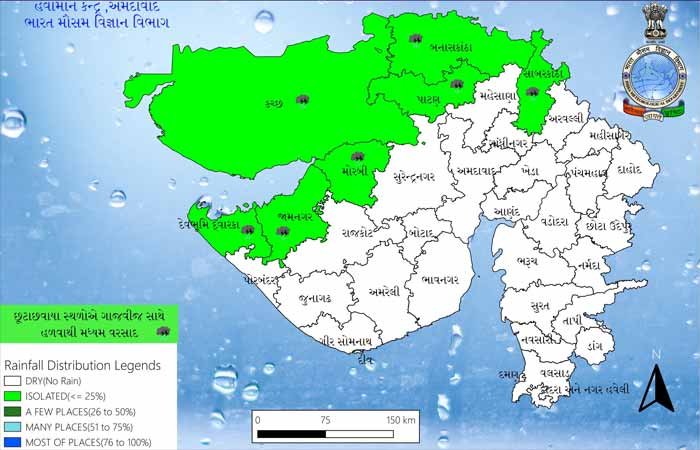 હવામાન વિભાગ અમદાવાદના ડાયરેક્ટર એ. કે. દાસે જણાવ્યું કે, ‘આજે 17 તારીખે તો હવામાન શુષ્ક રહેશે, પણ 18, 19 અને 20 તારીખે છૂટાછવાયા વિસ્તારોમાં વરસાદની શક્યતા છે, જેમાં 19 તારીખે વરસાદનો વ્યાપ વધારે રહેશે. 18 તારીખે બનાસકાંઠા, પાટણ, સાબરકાંઠા તેમજ જામનગર, મોરબી, દ્વારકા અને કચ્છમાં વરસાદ પડી શકે છે, જ્યારે 19 તારીખે ઉત્તર ગુજરાતના દાહોદ-પંચમહાલ સહિત દક્ષિણ ગુજરાત અને સૌરાષ્ટ્ર-કચ્છના તમામ જિલ્લાઓમાં વરસાદની સંભાવના છે. 18 અને 19 તારીખે ગાજવીજ અને વીજળીના કડાકા સાથે હળવોથી મધ્યમ વરસાદ થશે અને પવનની ગતિ 40થી 50 કિલોમીટર પ્રતિ કલાકની રહેશે.