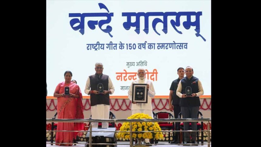 PMએ કહ્યું- વંદે માતરમ ભારતની સ્વતંત્રતાની ઘોષણા હતી. તે દરેક યુગમાં સુસંગત છે. 1937માં, વંદે માતરમનો એક ભાગ કાઢી નાખવામાં આવ્યો હતો. તેને ટુકડા કરી દેવામાં આવ્યો હતો. વંદે માતરમના વિભાજનથી દેશમાં ભાગલાના બીજ વાવ્યા. તે વિભાજનકારી વિચારસરણી આજે પણ દેશ માટે એક પડકાર છે. ઙખ મોદીએ કહ્યું – વંદે માતરમના મૂળ સ્વરૂપમાં લખ્યું છે કે ભારત માતા સરસ્વતી, લક્ષ્મી અને દુર્ગા છે. જ્યારે દુશ્ર્મને આતંકવાદ દ્વારા ભારતની સુરક્ષા અને સન્માન પર હુમલો કરવાની હિંમત કરી, ત્યારે આખી દુનિયાએ જોયું કે નવું ભારત જાણે છે કે આતંકવાદનો નાશ કરવા માટે દુર્ગા કેવી રીતે બનવું. વડાપ્રધાન મોદીએ રાષ્ટ્રગીતની 150મી વર્ષગાંઠ નિમિત્તે એક ટપાલ ટિકિટ અને એક સિક્કો બહાર પાડ્યો. તેમણે એક વર્ષ સુધી ચાલનારા સ્મૃતિ સમારોહનું ઉદ્ઘાટન કર્યું અને એક વેબસાઇટ લોન્ચ કરી. ઙખએ વંદે માતરમના સામૂહિક ગાયન કાર્યક્રમમાં પણ ભાગ લીધો હતો. વડાપ્રધાનએ કહ્યું- વંદે માતરમની પંક્તિ – ‘સુજલામ, સુફલામ, મલયજ શીતલામ, શસ્યશ્યામલામ માતરમ’ પ્રકૃતિના દિવ્ય આશીર્વાદથી સુશોભિત આપણી માતૃભૂમિને નમન કરે છે.