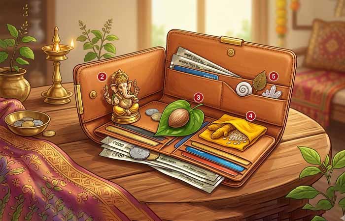 આર્થિક સ્થિરતા અને ધન વૃદ્ધિ માટે પર્સમાં 5 શુભ વસ્તુઓ રાખવાની સલાહ આપવામાં આવે છે. ગુરુવારે હળદરથી રંગેલા થોડા અક્ષત(ચોખા) કાગળમાં લપેટીને રાખવાથી ફિજૂલ-ખર્ચી અટકે છે. સોમવારે ચાંદીનો નાનો ચોરસ ટુકડો રાખવાથી સકારાત્મક ઊર્જા મળે છે, જ્યારે શુક્રવારે લક્ષ્મીજીનો નાનો ફોટો રાખવાથી ધન આકર્ષિત થાય છે. આ ઉપરાંત, આવક વધારવા માટે ગુરુવારે ગોમતી ચક્ર અને વેપારમાં પ્રગતિ માટે બુધવારે બે લીલી ઈલાયચી પર્સમાં રાખવી અત્યંત શુભ માનવામાં આવે છે.