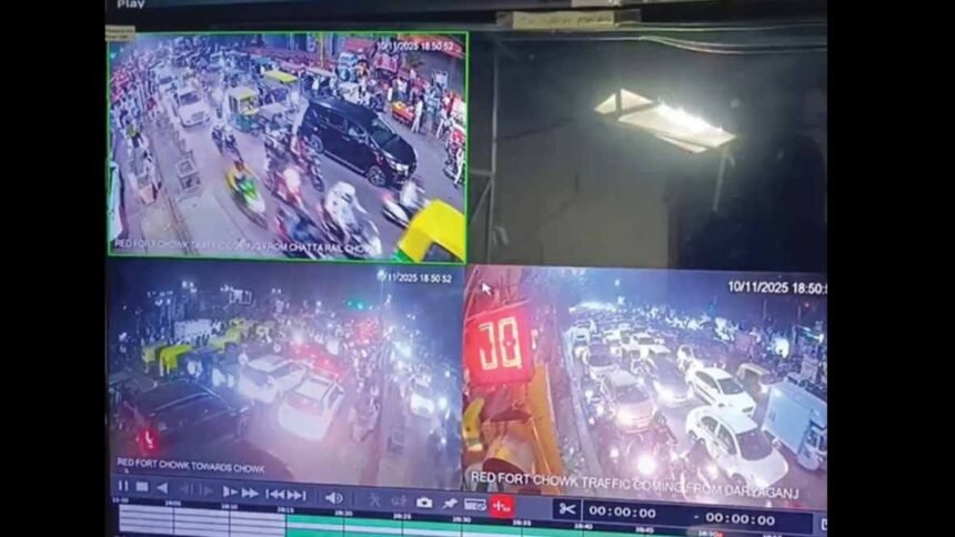 CCTV ફૂટેજ પર 10 નવેમ્બર, 2025ની તારીખ અને સાંજે 6 વાગીને 50 મિનિટ અને 52 સેકન્ડનો સમય દેખાઈ રહ્યો છે. વીડિયોમાં જોઈ શકાય છે કે સાંજનો અંધકાર છવાઈ ગયો છે અને ચાર રસ્તા પર ભારે ટ્રાફિક છે. બાઇક, કાર અને ઓટોની લાંબી કતારો જોવા મળી રહી છે. ટ્રાફિક સિગ્નલ લીલો થતાં જ વાહનો ધીમે-ધીમે આગળ વધી રહ્યા હોય છે, ત્યારે જ અચાનક એક આગનો વિશાળ ગોળો ભભૂકી ઉઠે છે અને ક્ષણભરમાં ચારે બાજુ અંધારું છવાઈ જાય છે.