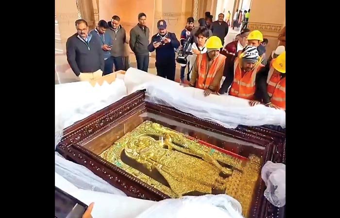 અયોધ્યામાં રામલલ્લા મંદિર કેમ્પસમાં જલદી એક ખૂબ જ ભવ્ય અને કીમતી પ્રતિમા સ્થાપિત થવાની છે. સોનાની ચમકવાળી આ પ્રતિમામાં હીરા-પન્ના અને ઘણાં રત્નો જડેલાં છે. એને કર્ણાટકના એક અજાણ્યા ભક્તે દાન કરી છે. મંગળવારે સાંજે પ્રતિમા કર્ણાટકથી અયોધ્યા લાવવામાં આવી. પ્રતિમા 10 ફૂટ ઊંચી અને 8 ફૂટ પહોળી છે. અંદાજિત કિંમત 25થી 30 કરોડ છે. નિર્માણ દક્ષિણ ભારતની શિલ્પકલાથી કરવામાં આવ્યું છે. શ્રીરામ જન્મભૂમિ તીર્થ ક્ષેત્ર ટ્રસ્ટના સભ્ય ડો. અનિલ મિશ્રાએ જણાવ્યું- પ્રતિમા કોણે મોકલી છે, હજુ સુધી એની જાણ થઈ નથી.એેનું વજન કરાવવામાં આવી રહ્યું છે, જોકે અનુમાન છે કે 5 ક્વિન્ટલ વજનની પ્રતિમા હશે. જલદી જ સંપૂર્ણ વિગતો શેર કરવામાં આવશે. આ પ્રતિમાને સંત તુલસીદાસ મંદિર પાસે અંગદ ટીલા પર સ્થાપિત કરવા પર વિચાર કરવામાં આવી રહ્યો છે. એેની સ્થાપના પહેલાં એનું અનાવરણ કરવામાં આવશે. અનાવરણ પછી પ્રાણ-પ્રતિષ્ઠા સમારોહ થશે, જેમાં દેશભરના સંતો અને મહંતોને બોલાવવામાં આવશે.
