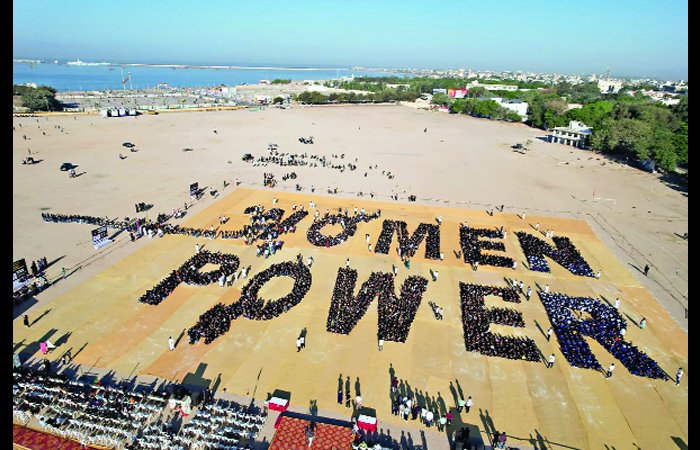 પોરબંદરના ચોપાટી મેળામેદાન ખાતે અદ્દભૂત અને ઐતિહાસિક ક્ષણ સર્જાઈ હતી, જ્યાં છ હજારથી વધુ શહેરીજનો એકત્ર થઈ ’વુમન પાવર’ માનવ સાંકળ રચી અનોખો ઈતિહાસ રચ્યો હતો. આ ભવ્ય કાર્યક્રમમાં ધારાસભ્ય અર્જુન મોઢવાડીયા, પૂર્વ શિક્ષણમંત્રી ભૂપેન્દ્રસિંહ ચુડાસમા, પૂર્વ કેબિનેટ મંત્રી બાબુભાઈ બોખીરીયા, જિલ્લા રમતગમત અધિકારી પ્રવીણાબેન પાંડાવદરા, જિલ્લા કલેક્ટર એસ.ડી. ધાનાણી સહિત અનેક આગેવાનો ઉપસ્થિત રહ્યા હતા. આ મહાકાય કાર્યક્રમનું આયોજન રોટરી ક્લબ ઓફ પોરબંદર, રોટરેક્ટ ક્લબ ઓફ પોરબંદર અને એક્સટ્રીમ ફિટનેસ કેરના સંયુક્ત ઉપક્રમે કરવામાં આવ્યું હતું. મહિલાઓના સશક્તિકરણ અને સ્વરક્ષણ માટે વિશ્વ રેકોર્ડ સ્થાપવાનું ધ્યેય રાખી, આ વિશિષ્ટ માનવ સાંકળ રચવામાં આવી હતી. વિશાળ સંખ્યામાં પોરબંદરવાસીઓએ આ ઈતિહાસ રચવામાં પોતાનું યોગદાન આપ્યું. આ કાર્યક્રમમાં વિવિધ સંસ્થાઓના પ્રતિનિધિઓ અને પોરબંદરના અગ્રણીઓએ મોટી સંખ્યામાં હાજરી આપી હતી.આ કાર્યક્રમમાં 12 થી 40 વર્ષ સુધીની કોઈપણ વ્યક્તિ ભાગ લઈ શકી હતી, અને એન્ટ્રી ફી વિનાની હાજરીને કારણે લોકો મોટી સંખ્યામાં જોડાયા હતા. આ માનવ સાંકળને યાદગાર બનાવતા, દરેક ભાગ લેનારને વર્લ્ડ રેકોર્ડ પ્રોજેક્ટનું સર્ટિફિકેટ આપવામાં આવ્યું, જેની મદદથી તેઓ પોતાને ગૌરવપૂર્ણ ક્ષણનો હિસ્સો માનશે. કાર્યક્રમમાં તમામ લોકોએ બ્લેક અથવા ડાર્ક બ્લૂ રંગના ટોપ અથવા ટી-શર્ટ પહેરી વિશિષ્ટ એકતા પ્રદર્શિત કરી હતી.
